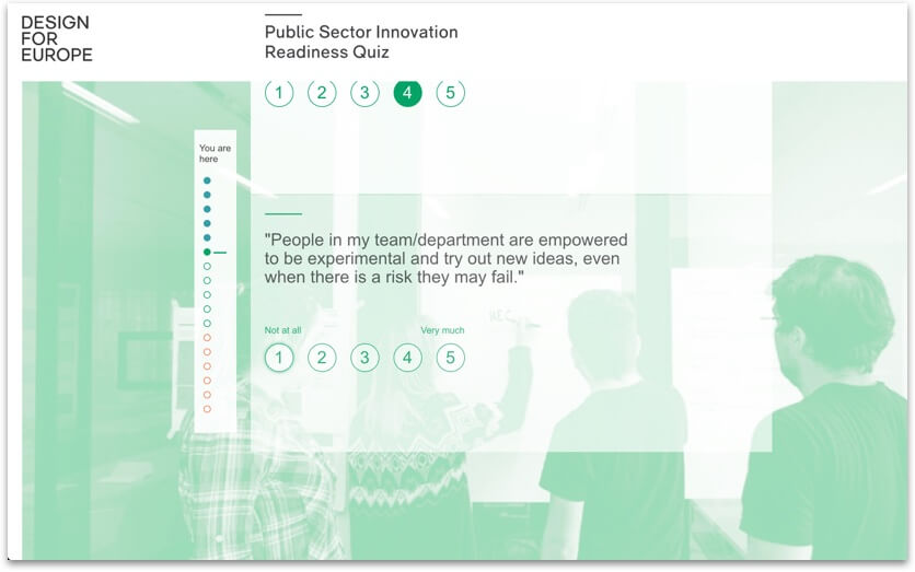 An interactive ‘tool’ for Design for Europe in collaboration with Nesta. The diagnostic allows public sector decision makers to benchmark themselves, their teams and their organisation for designed innovation friendliness.