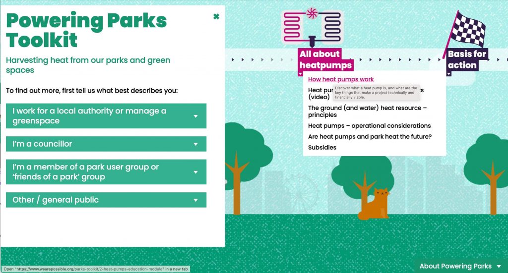 Powering Parks is an innovative programme exploring how we can harvest heat from our parks and green spaces by installing heat pumps. Working with the Possible design team, we built this toolkit for those interested in exploring further.