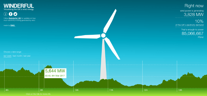 Over on twitter,  @winderful_uk , tweets, landmark levels of wind energy, as well as providing a “while you were sleeping” nightly update.  We’ve also been playing with an Arduino-powered physical representation of the data too, which could eventually turn a physical model turbine, or illuminate a light display.